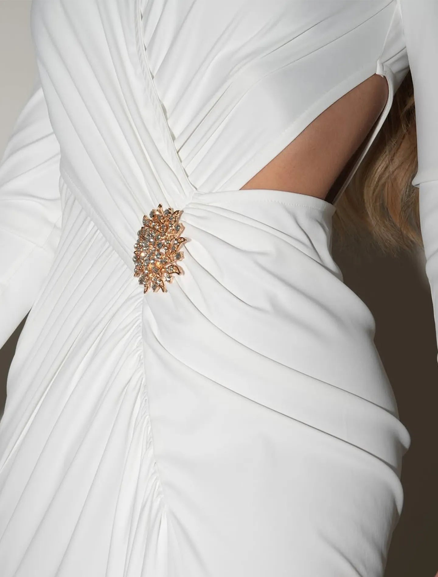 • Embellished Brooch Accent, V-Neckline, Long Sleeves,Side Cutout Detail, Ruched Waistline, High Slit Design, Maxi Length.