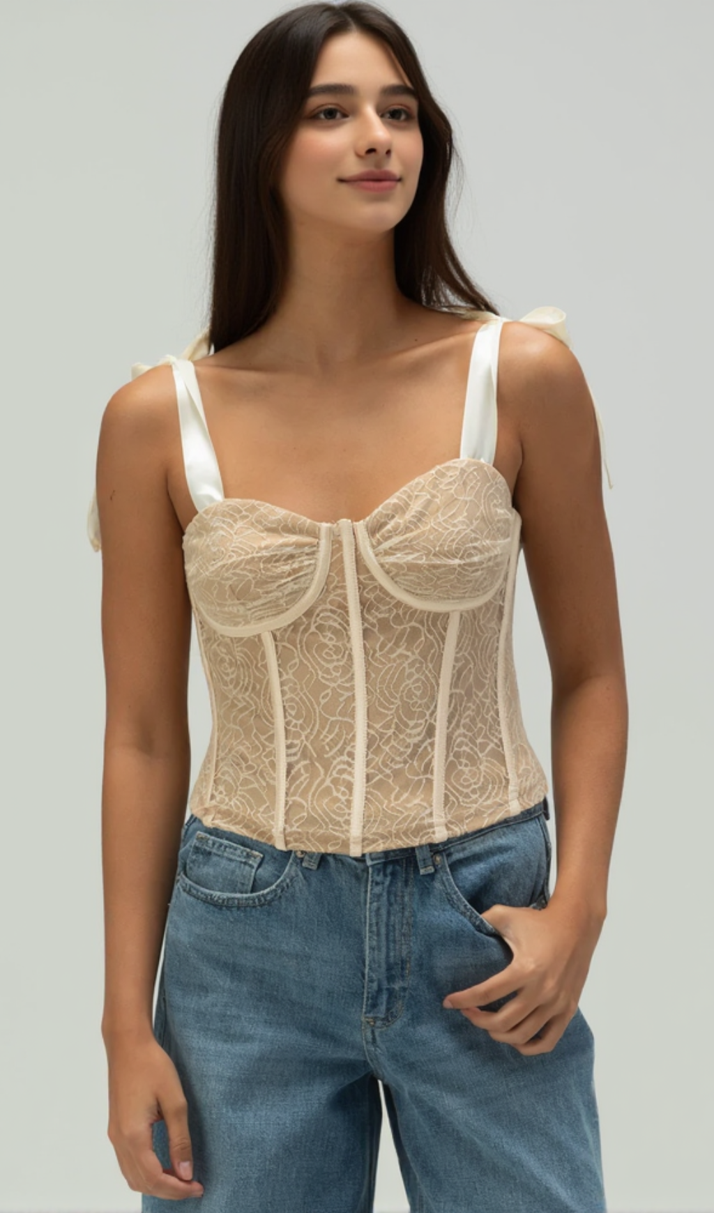 West Of Melrose Lace Corset Top. This women's lace corset top offers a sophisticated and feminine look with its intricate lace detailing and structured corset design. The self-tie ribbon shoulder straps add a customizable and adjustable fit, enhancing both comfort and style.