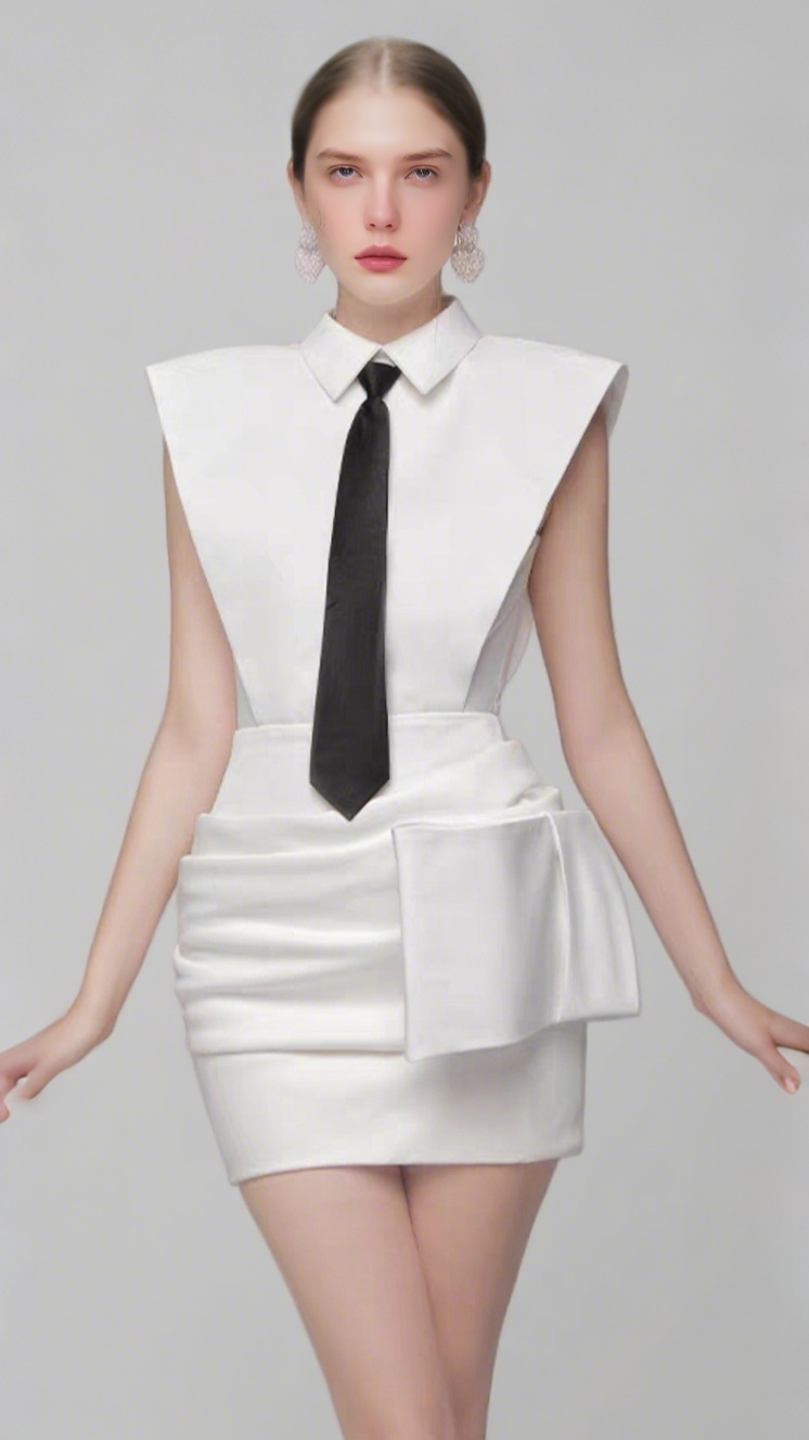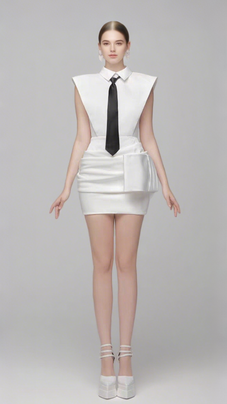 White Bowknot Mini Dress With Necktie