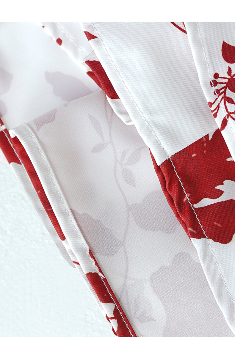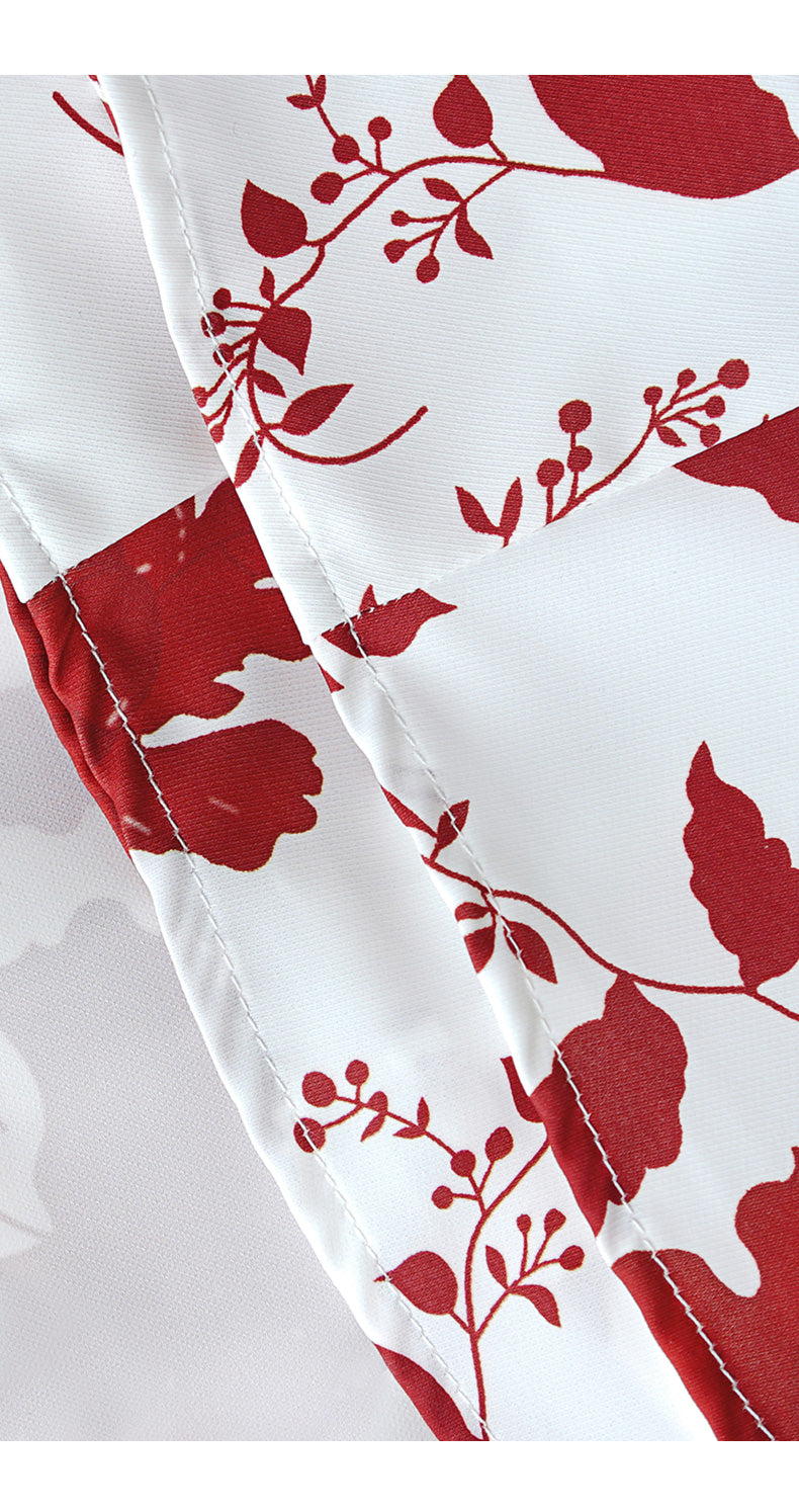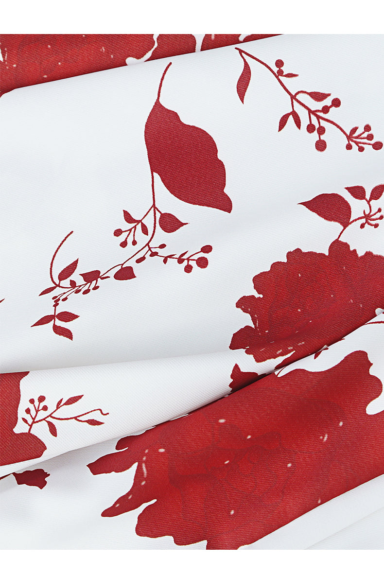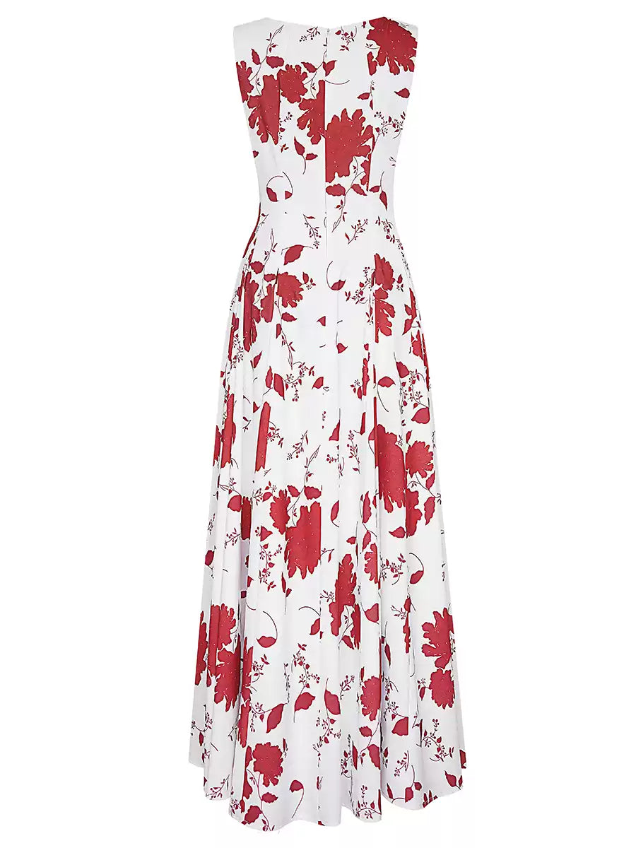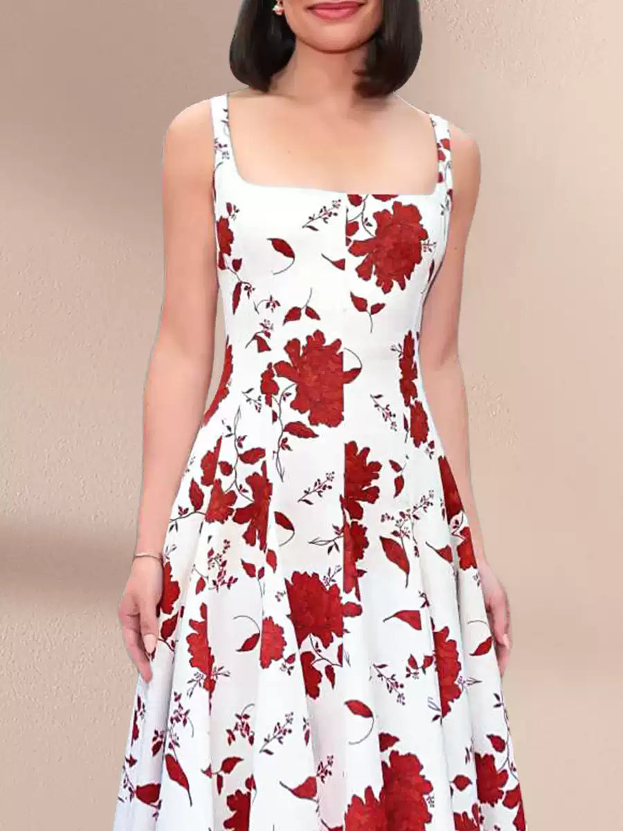 This dress features a clean white base adorned with bold red floral patterns. The square neckline and sleeveless design create an elegant, timeless look, while the flowing maxi skirt adds a touch of grace. Ideal for special occasions like summer weddings, garden parties, or dinners. It combines classic charm with a vibrant print, ensuring you stand out in style.